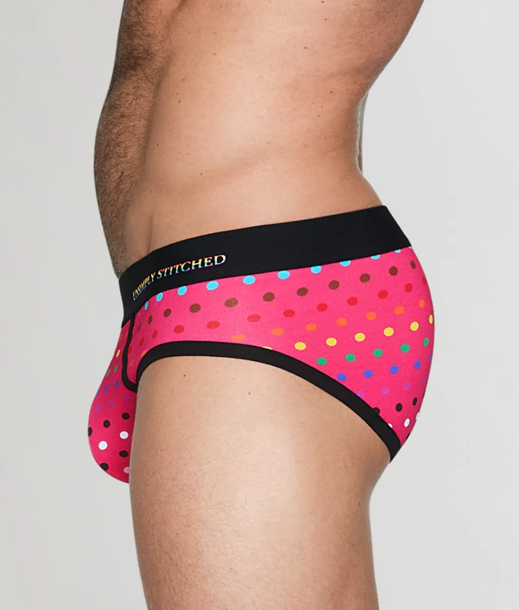 Of course, the real showstopper here is the vibrant polka dot pattern – a fun, eye-catching nod to pride that adds a pop of personality to your collection. Whether you’re slipping into them for daily wear or a special occasion, these briefs let you express yourself in style.