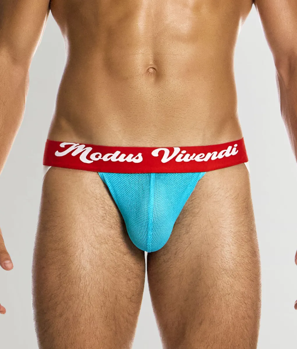 Get ready to go retro-cool with the Modus Vivendi Retro Jockstrap, crafted in a cheeky low-rise cut that sits snugly under the waistline and flirts with your hip bones. The design offers a supportive front pouch and minimalist strap-style back coverage—no briefs, no frills, just bold confidence. Made from semi-transparent retro micro fishnet in 100% recycled cotton, this jock feels delightfully cool to the touch, breathable, and moisture-wicking—perfect for long summer days or spirited dancefloor moves. The contour pouch adds just the right lift and definition, with neat trim accentuating the curve. A thick no-roll jacquard waistband sports bold, retro logo lettering—slimming the waist while keeping branding loud and proud. Complementary trim around the pouch and leg straps amps the visual pop. The Modus Vivendi Retro Jockstrap delivers vintage style with modern support and eco-friendly flair—seriously fun underwear with functional comfort.