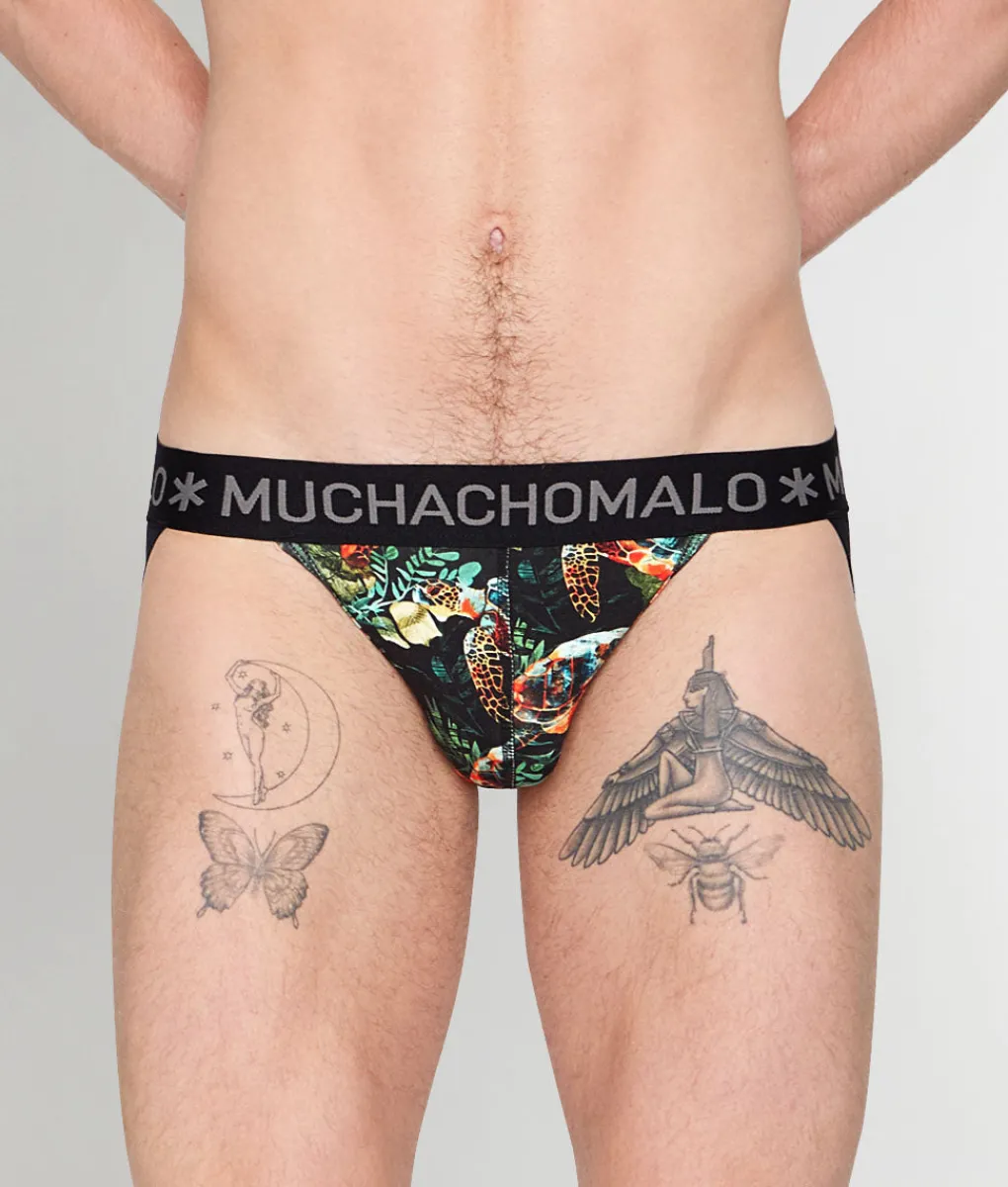 Unleash your oceanic confidence with the Muchachomalo Turtle Jockstrap, where tropical turtle-inspired design meets contemporary comfort in this expertly crafted essential. This mid-rise jockstrap sits perfectly at your natural waistline, featuring high-cut legs that offer minimal coverage while maximizing style and freedom of movement. Meticulously crafted from premium 95% cotton and 5% elastane fabric blend, this jockstrap feels luxuriously soft against your skin while delivering exceptional stretch and recovery for all-day comfort. The breathable cotton material naturally wicks moisture away from your body, keeping you fresh and dry throughout your most active days, while the elastane provides that perfect stretch for unrestricted movement. The expertly designed contour pouch provides exceptional support and lift, with an innovative design that naturally enhances your shape while ensuring maximum comfort with every movement. The thick, no-roll waistband features bold MUCHACHOMALO lettering that adds an extra touch of contemporary flair to your underwear collection. The back straps are crafted with medium thickness for optimal comfort and secure fit without digging in, perfectly complementing the striking marine turtle design elements. Elevate your underwear drawer with the tropical sophistication of the Muchachomalo Turtle Jockstrap.