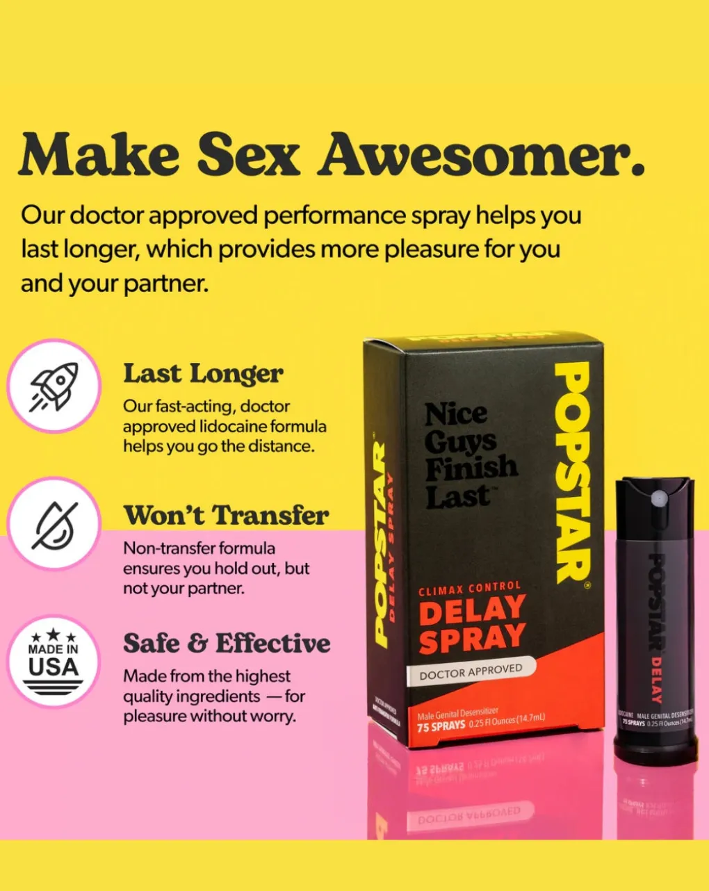 Take charge of your pleasure with Popstar Delay Spray, a fast-acting, doctor-recommended solution designed to help you last longer, stay in control, and enhance pleasure for you and your partner. This easy-to-use spray relaxes nerve cells and postpones climax, keeping performance anxiety and premature ejaculation at bay—so you can go the distance with confidence.