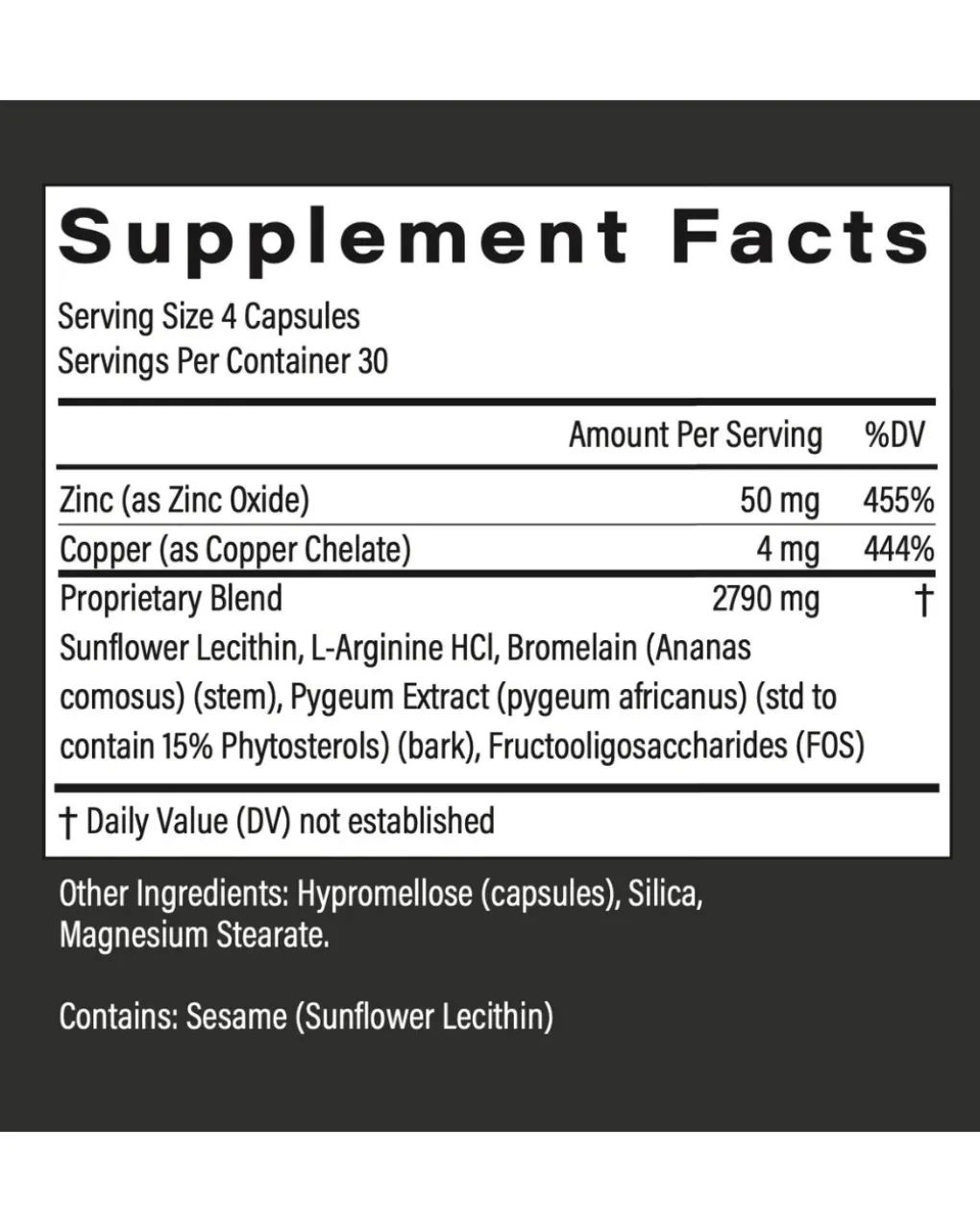 Contains: Bromelain, Pygeum, Lecithin, Zinc, L-Arginine, Fructose