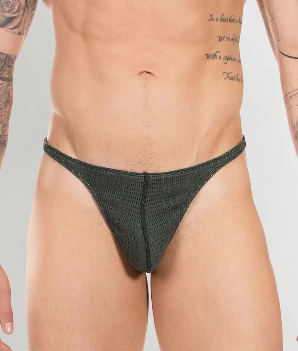 The contoured pouch provides supportive shaping and a natural lift without bulky padding or restrictive seams, offering comfort with a sculpted look. In the back, the thong strap is slim yet sturdy, fitting snugly between the cheeks for a confident, barely-there feel without digging in.