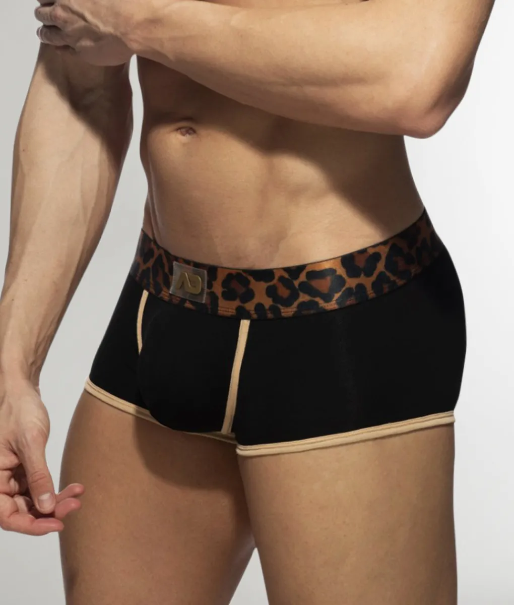 Experience a blend of comfort and style with the Addicted Leopard Black Trunk, designed for those who dare to stand out. This mid-rise trunk sits just below the waistline, offering a flattering fit with a high-cut leg and full-coverage back that hugs your curves perfectly. Crafted from premium, breathable fabric, it keeps you cool to the touch while efficiently wicking away moisture, ensuring all-day comfort. The contour pouch features Almost Naked technology, providing lift and support without compromising on freedom of movement. The thick, no-roll waistband showcases a subtle logo, adding a touch of flair while creating a slimming effect.