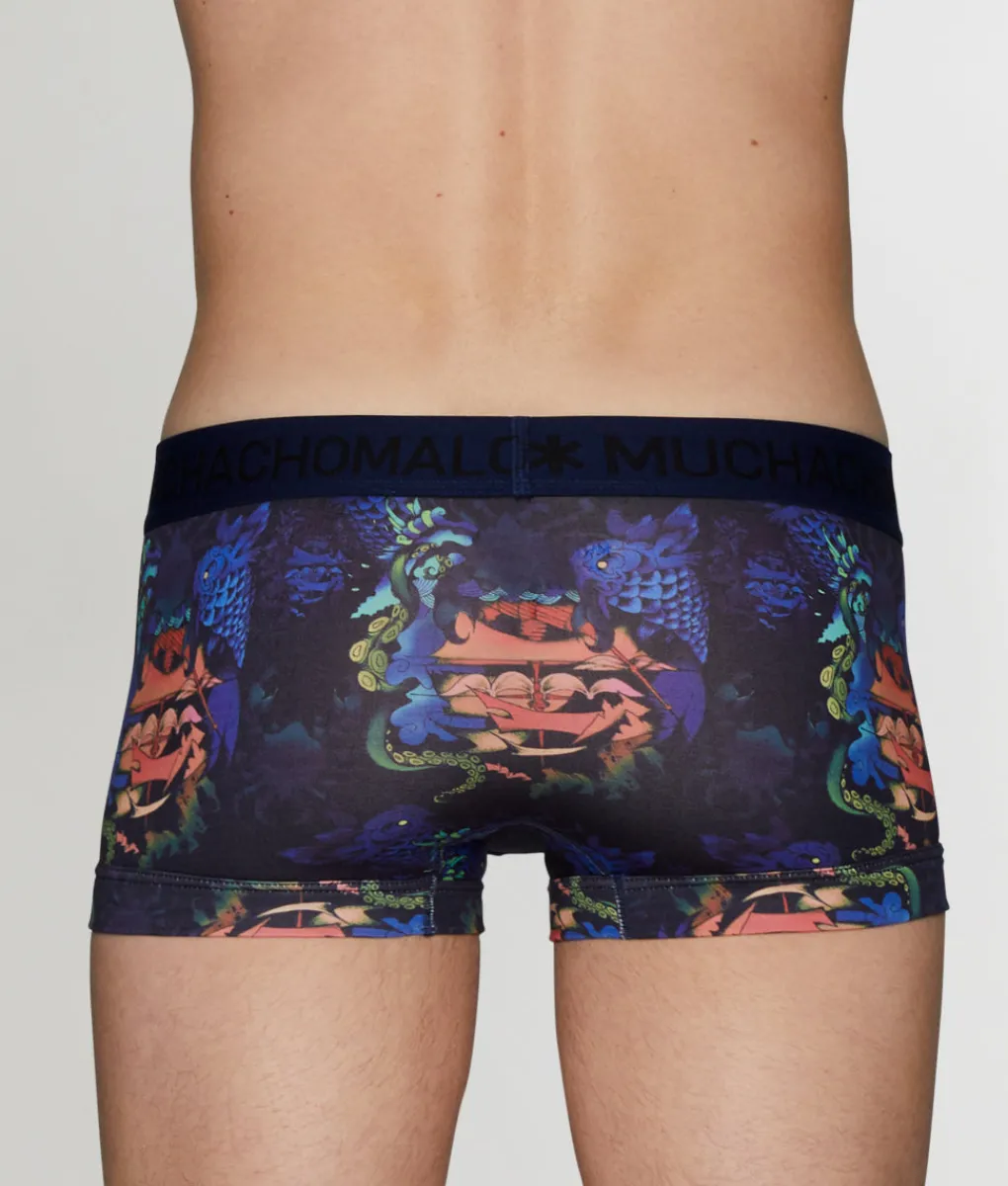 Ultra-soft and breathable, this 95-percent cotton trunk is an excellent ode to the deep. You’ve got a low-rise fit that lengthens the look of your torso and draws attention to your V-lines. A contoured pouch gives lift and support without feeling restrictive, so you can jump, step, and run with comfort. Up top, you’ve got a two-tone elastic waistband with the standard Muchachomalo lettering all the way around. Down below on the body, you’ve got a beautiful pattern that includes a ship and its masts in the grips of a menacing tentacle, crabs, and a colorful underwater scene.