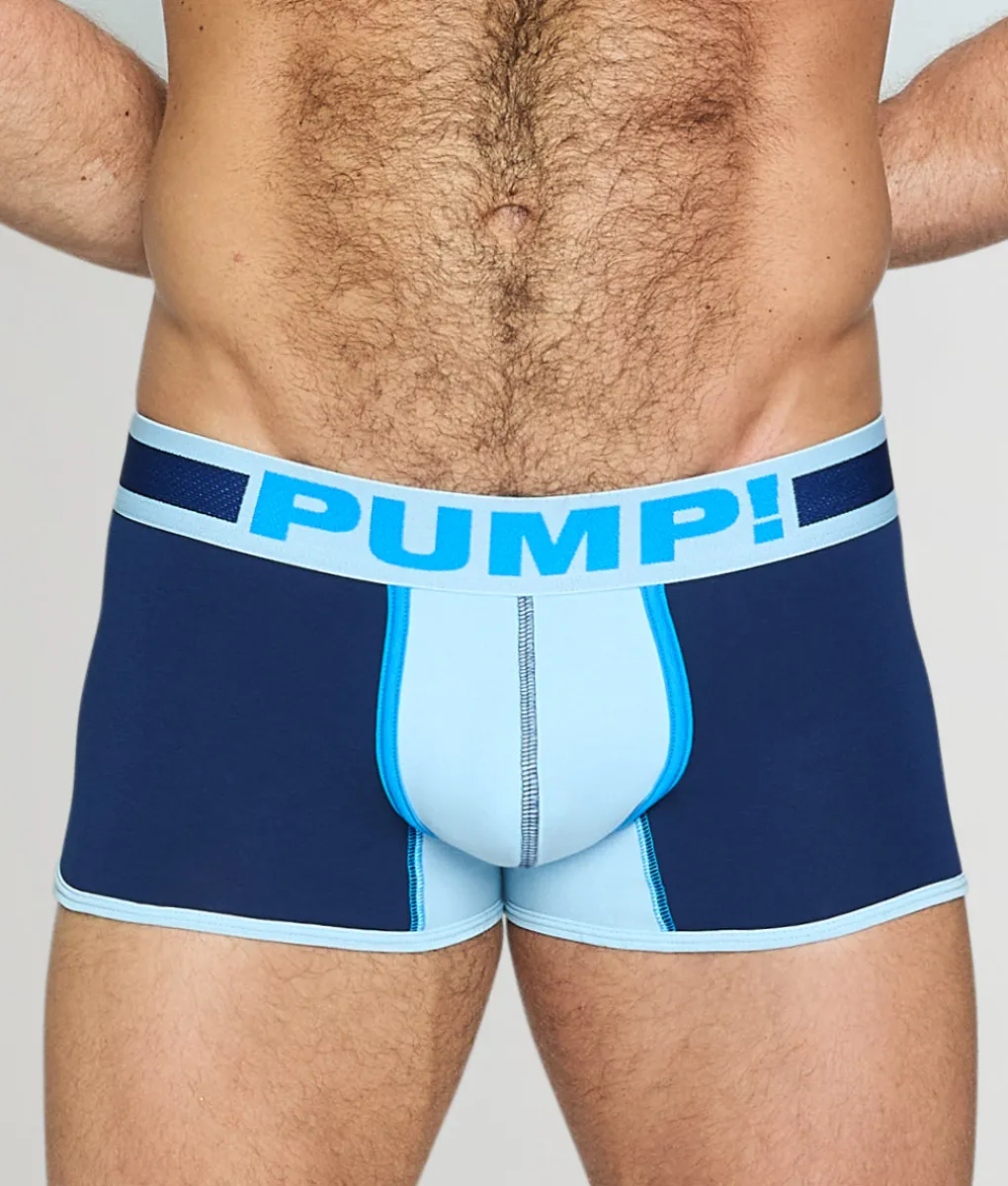The PUMP! Mercury Trunk delivers a sporty, mid-rise fit with a 45mm inseam, offering just the right balance of thigh coverage and movement. Made from ultra-breathable micro-mesh, the fabric feels light, cool to the touch, and wicks away moisture like a pro—perfect for gym sessions or all-day wear. The contoured pouch provides a natural lift with bold piping for extra support and style. A thick, no-roll waistband with eye-catching PUMP! branding adds a confident touch, while contrasting panel details amp up the visual impact. The PUMP! Mercury Trunk is built to flex, breathe, and perform—because basics should never be boring.