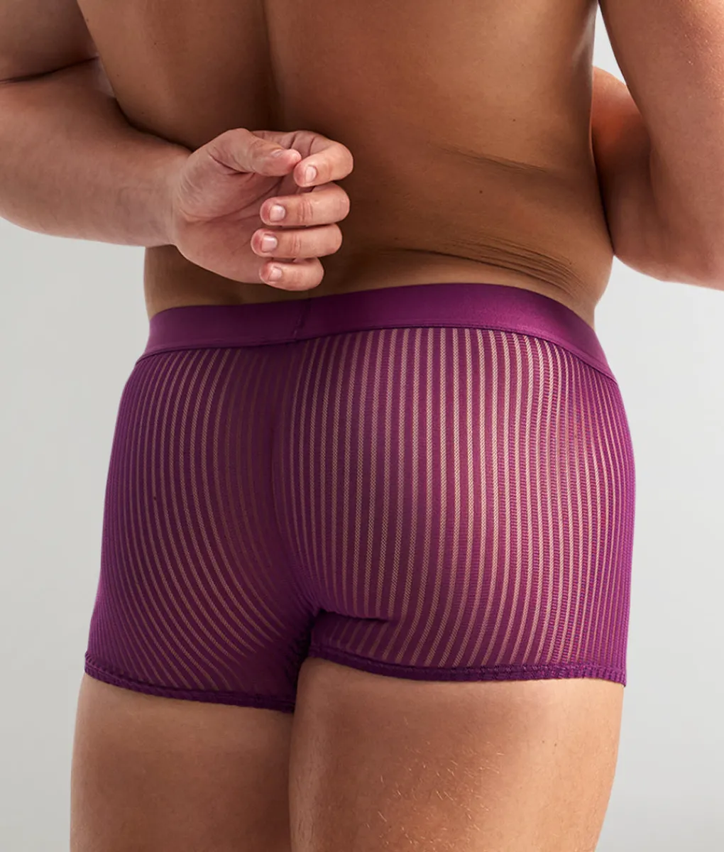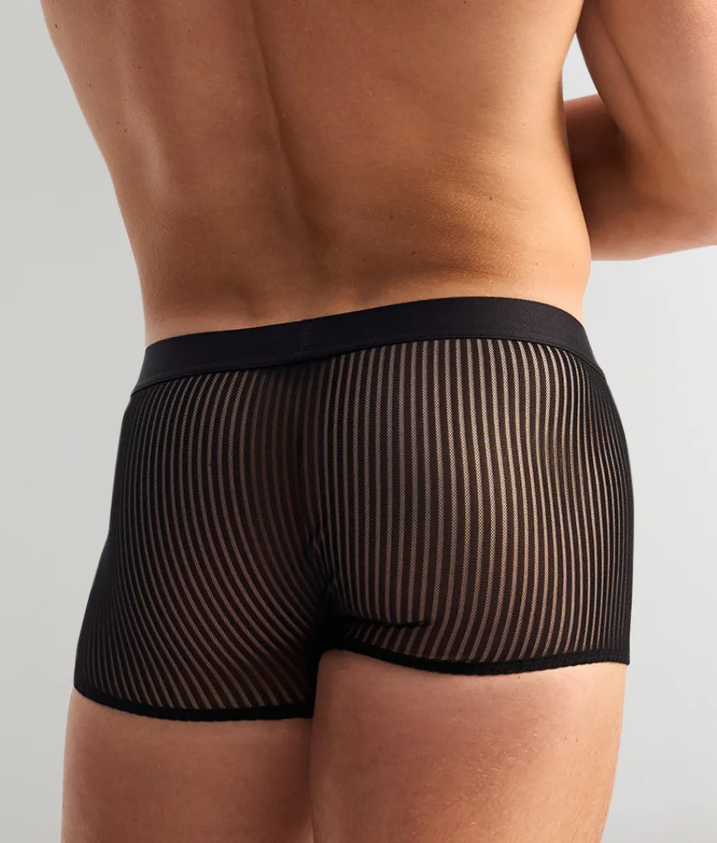 The Casanova Trunk is for the man who knows how to command attention with effortless confidence. This low-rise trunk sits perfectly on the hips, sculpting your physique with a sleek, body-enhancing fit. Designed with a shorter inseam for a modern, revealing look, it offers just the right amount of coverage while keeping things bold and ultra-sexy. The sheer striped fabric teases with glimpses of skin, while the solid fabric-lined pouch provides essential support and comfort.