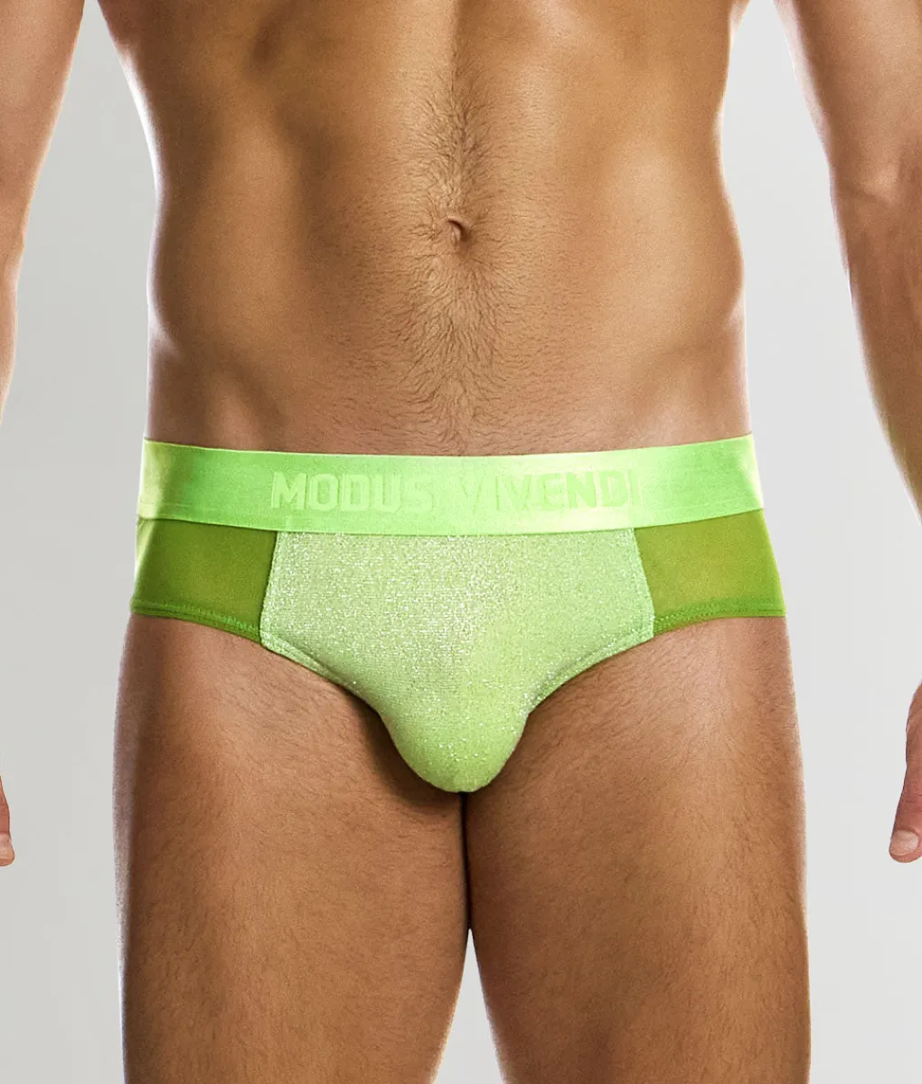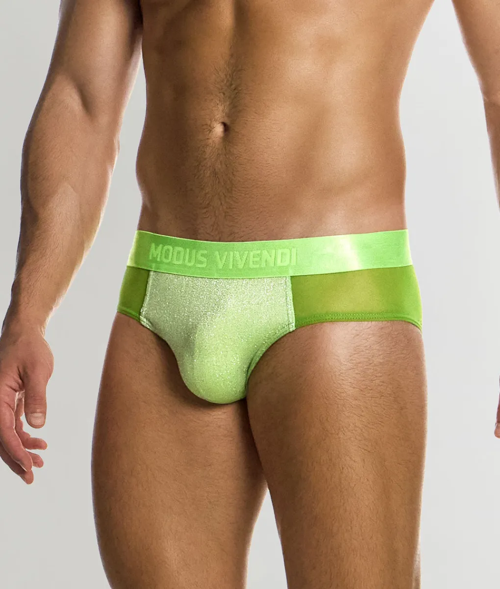 Dive into party-ready playfulness with the Modus Vivendi Delusion Classic Brief—a low-rise brief that struts the line between bold and classic. Sitting just under the waistline, this brief offers moderate side coverage balanced with full rear coverage for a polished silhouette that shines. Crafted from an elasticated knit blending polyester and multicolor metallic yarn, it sparkles under light and feels smooth against the skin. Breathable yet slightly luxurious, it keeps moisture at bay and feels cool during long nights. The pouch is unlined and gently contoured, offering lift and definition without bulk, accentuated by clean piping. Up top, a thick no-roll jacquard waistband with bold branding creates a subtle slimming effect while keeping things confidently cheeky. Complementary details around the side panels—crafted from transparent muslin-like stretch fabric—add that extra pop without overwhelming the design. The Modus Vivendi Delusion Classic Brief gives you sparkle, support, and swagger in one party-ready package.