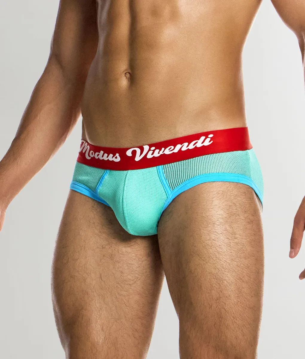 The Modus Vivendi Retro Classic Brief features a playful low-rise fit that sits just under the waistline, offering cheeky moderate side coverage and a full-coverage back – ideal for those who want retro vibes with modern comfort. Made from a semi-transparent, retro micro-fishnet mesh crafted from 100% recycled cotton, it feels wonderfully cool, breathable, and slightly stretchy for sweaty days or dancefloor moves. The brief’s contour pouch delivers gentle lift and definition, trimmed with contrasting piping, and accentuates with supportive definition.