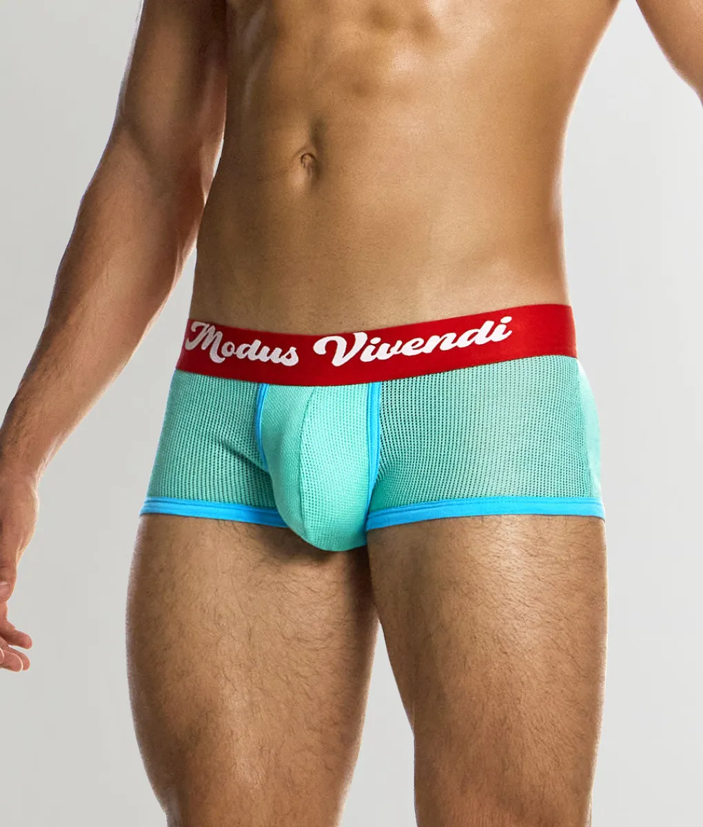 Step back in time with the Modus Vivendi Retro Trunk, a low-rise celebration of nostalgia that sits just below the hip, offering a cheerful high-cut leg and full rear coverage that balances vintage flair with modern comfort. Crafted from a semi-transparent micro-fishnet fabric made of 100% recycled cotton, this trunk feels cool and lightweight on the skin, with excellent breathability and natural moisture-wicking properties.
